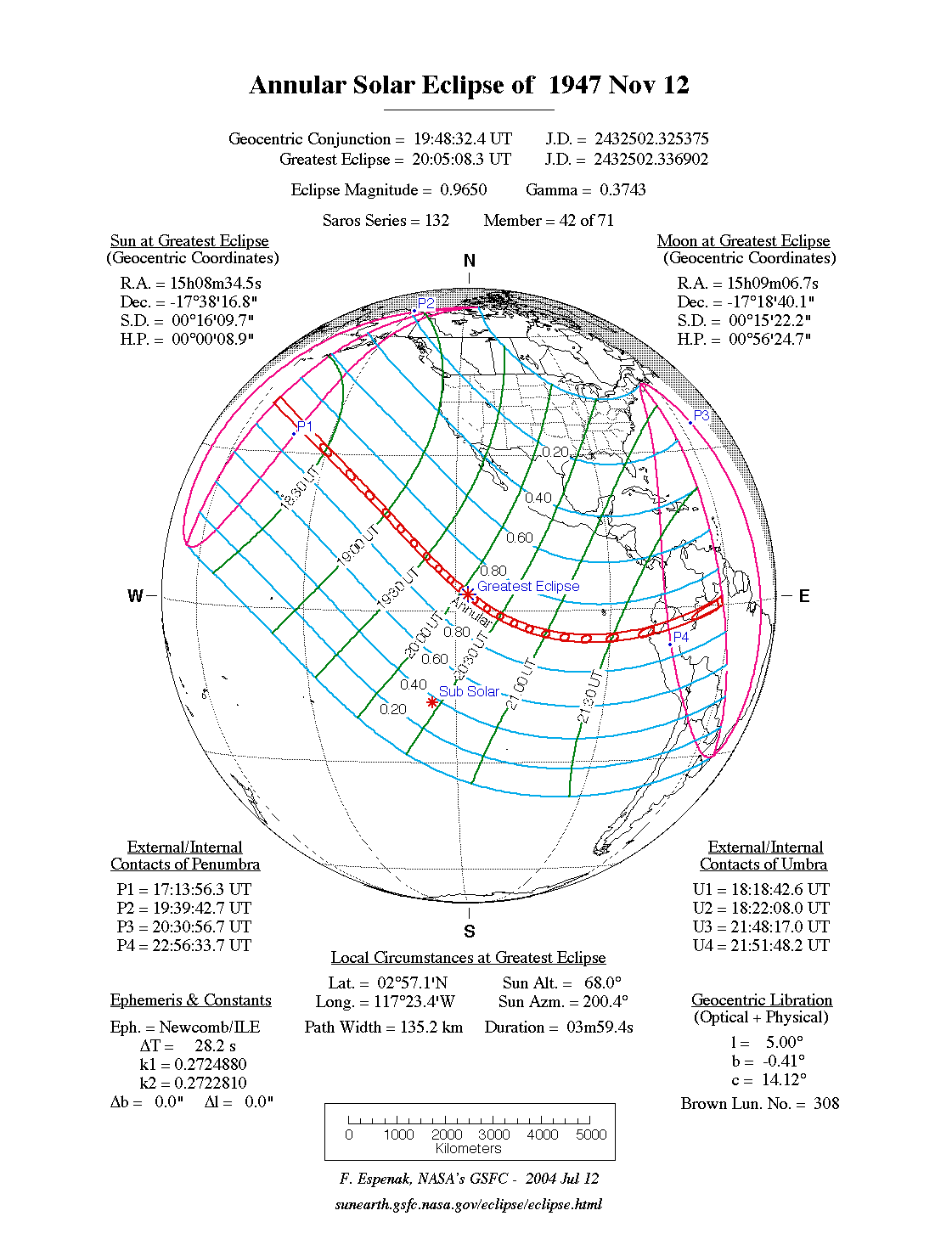 - Path Table: Annular Solar Eclipse of 1947 Nov 12 - coordinates of the central line and path limits