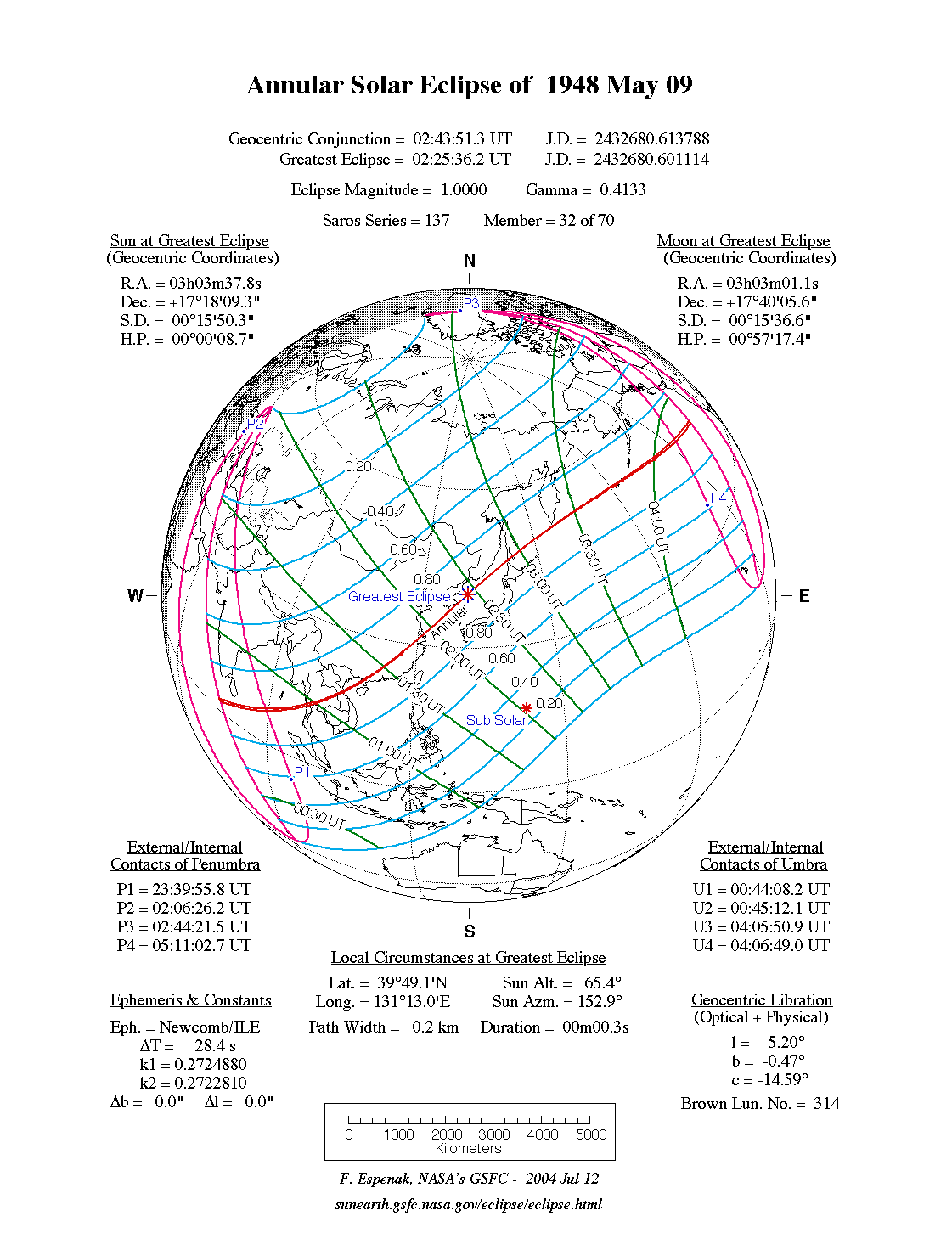- Path Table: Annular Solar Eclipse of 1948 May 09 - coordinates of the central line and path limits