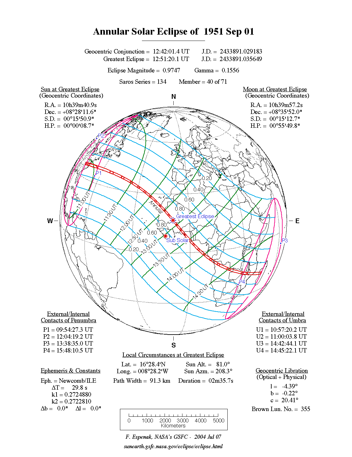 - Path Table: Annular Solar Eclipse of 1951 Sep 01 - coordinates of the central line and path limits