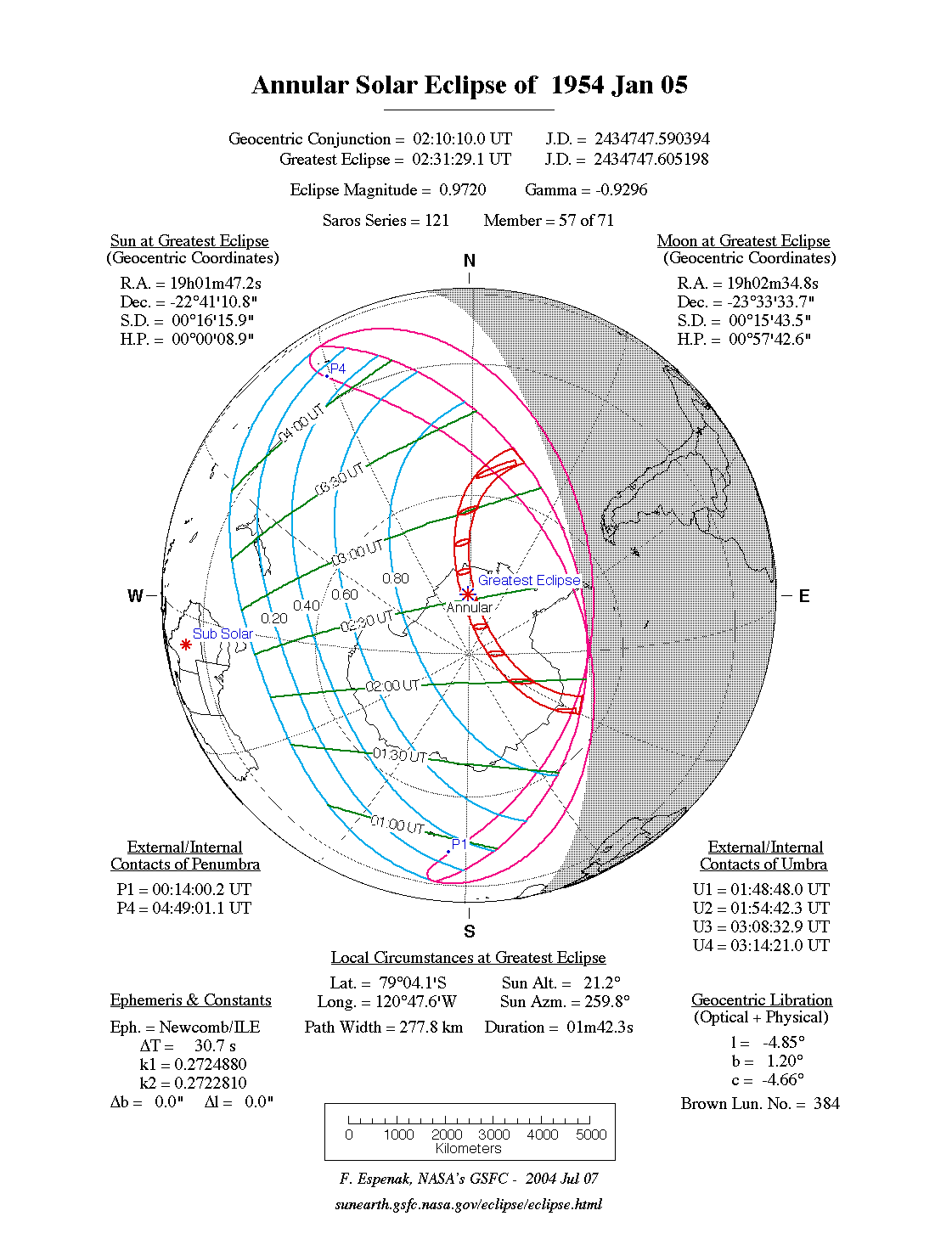 Predictions for the Annular Solar Eclipse of 1954 Jan 05were generated using the JPL DE406solar and lunar ephemerides. The lunar coordinates were calculated with respect to the Moon's Center of Mass. Although the predictions are first calculated in Terrestrial Dynamical Time (TD), they are then converted to Universal Time (UT1) as presented here.The parameter ΔT is used to convert between the two times (i.e., UT1 = TD - ΔT). For this eclipse ΔT has a value of 30.7 seconds.