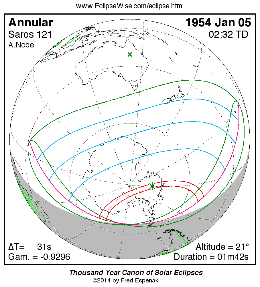 - Orthographic Map: Annular Solar Eclipse of 1954 Jan 05 - detailed map of eclipse visibility