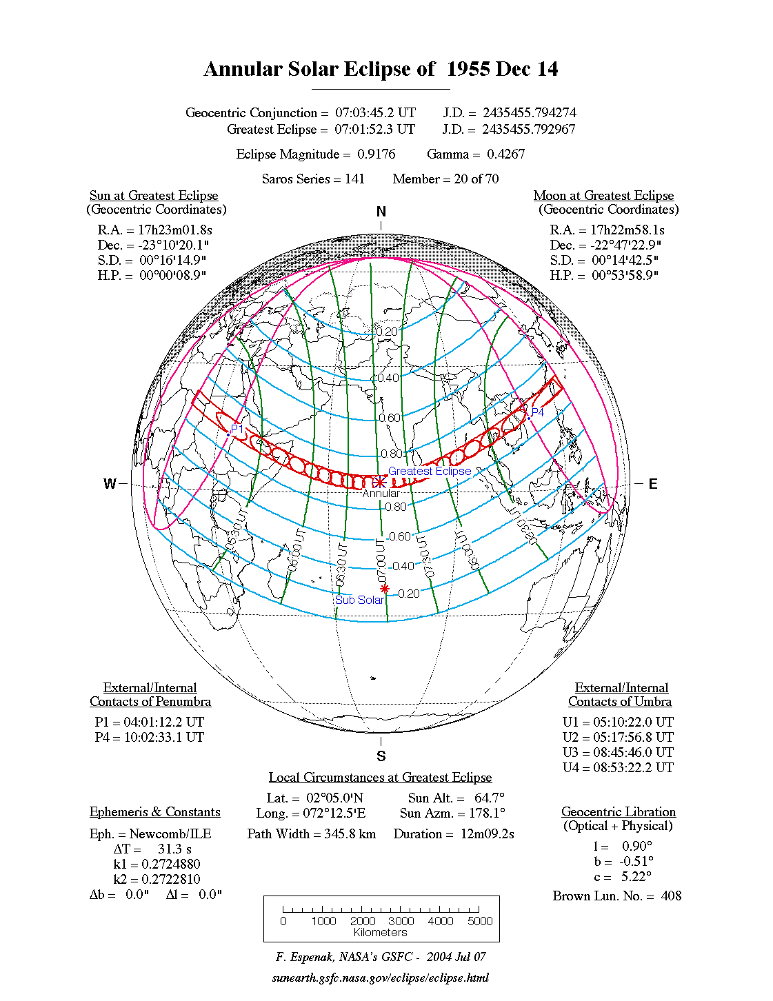 - Path Table: Annular Solar Eclipse of 1955 Dec 14 - coordinates of the central line and path limits