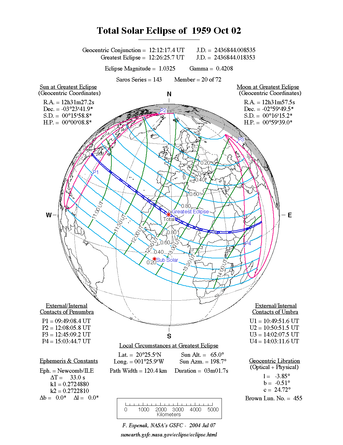 - Path Table: Total Solar Eclipse of 1959 Oct 02 - coordinates of the central line and path limits