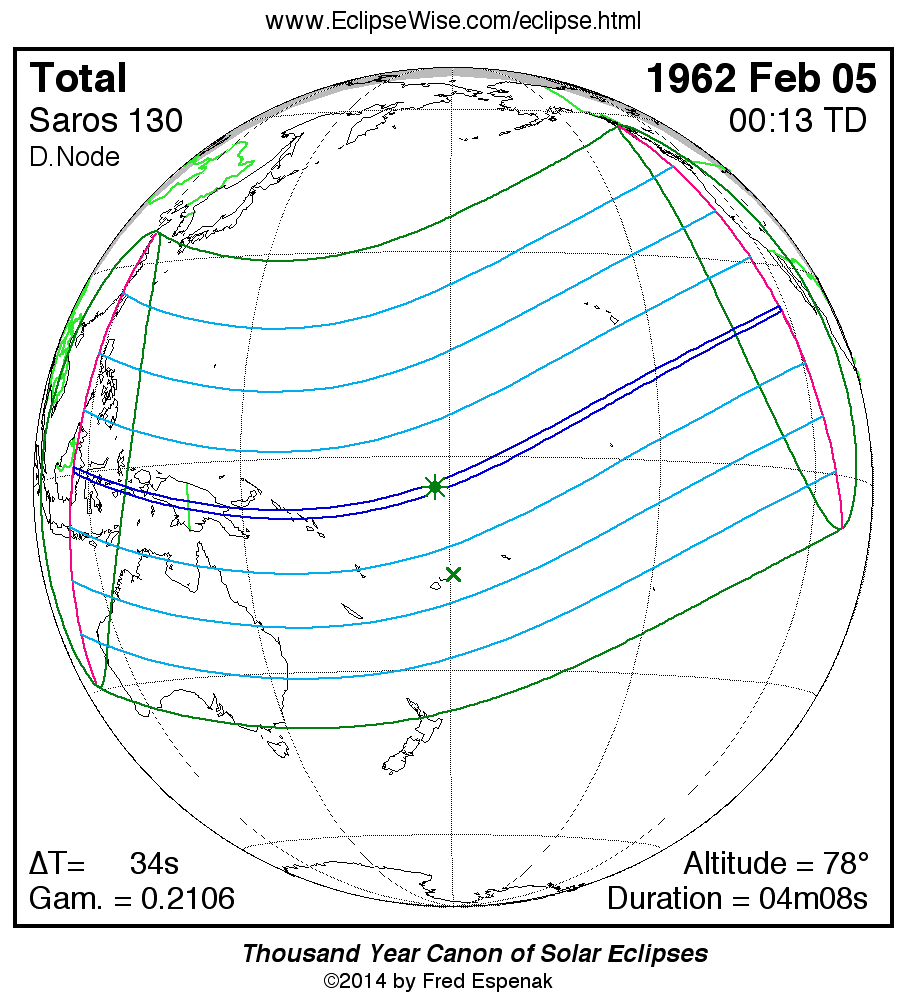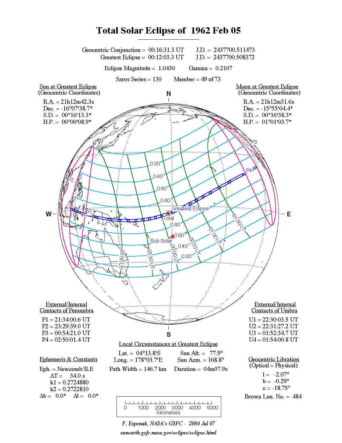 - Path Table: Total Solar Eclipse of 1962 Feb 05 - coordinates of the central line and path limits