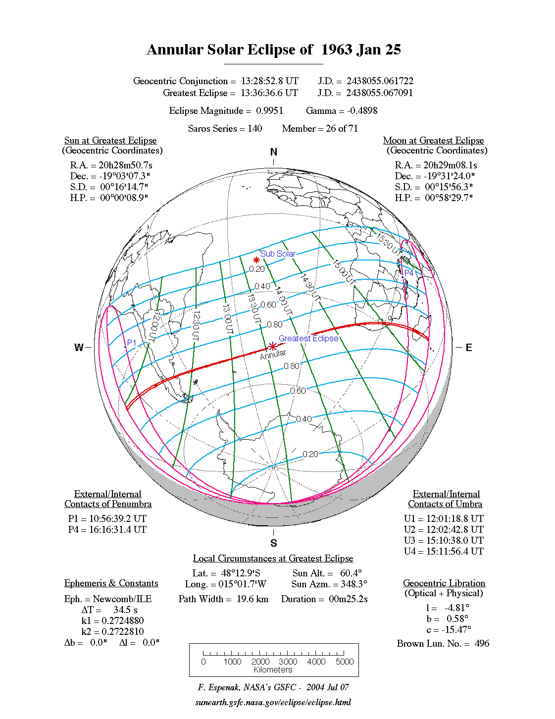 - Path Table: Annular Solar Eclipse of 1963 Jan 25 - coordinates of the central line and path limits