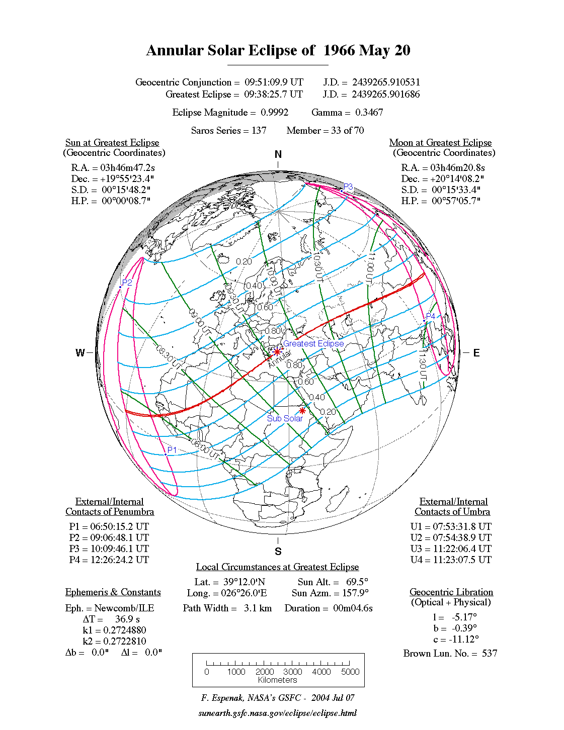 - Path Table: Annular Solar Eclipse of 1966 May 20 - coordinates of the central line and path limits
