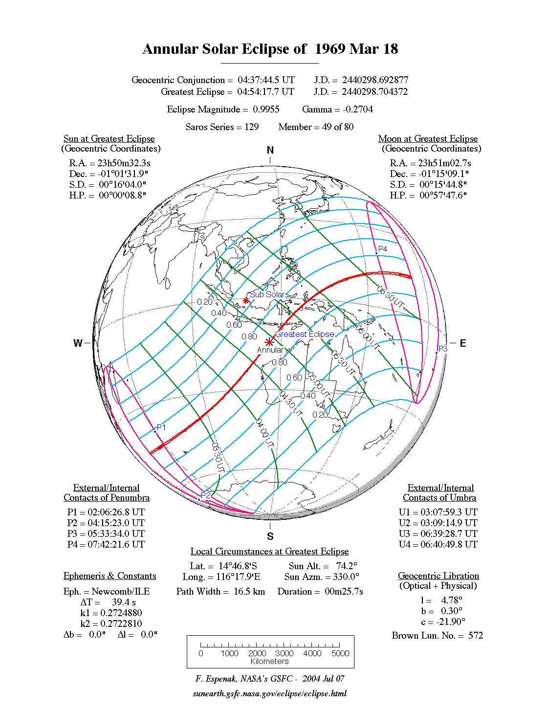 - Path Table: Annular Solar Eclipse of 1969 Mar 18 - coordinates of the central line and path limits
