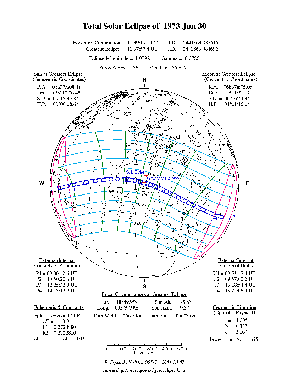 - Path Table: Total Solar Eclipse of 1973 Jun 30 - coordinates of the central line and path limits