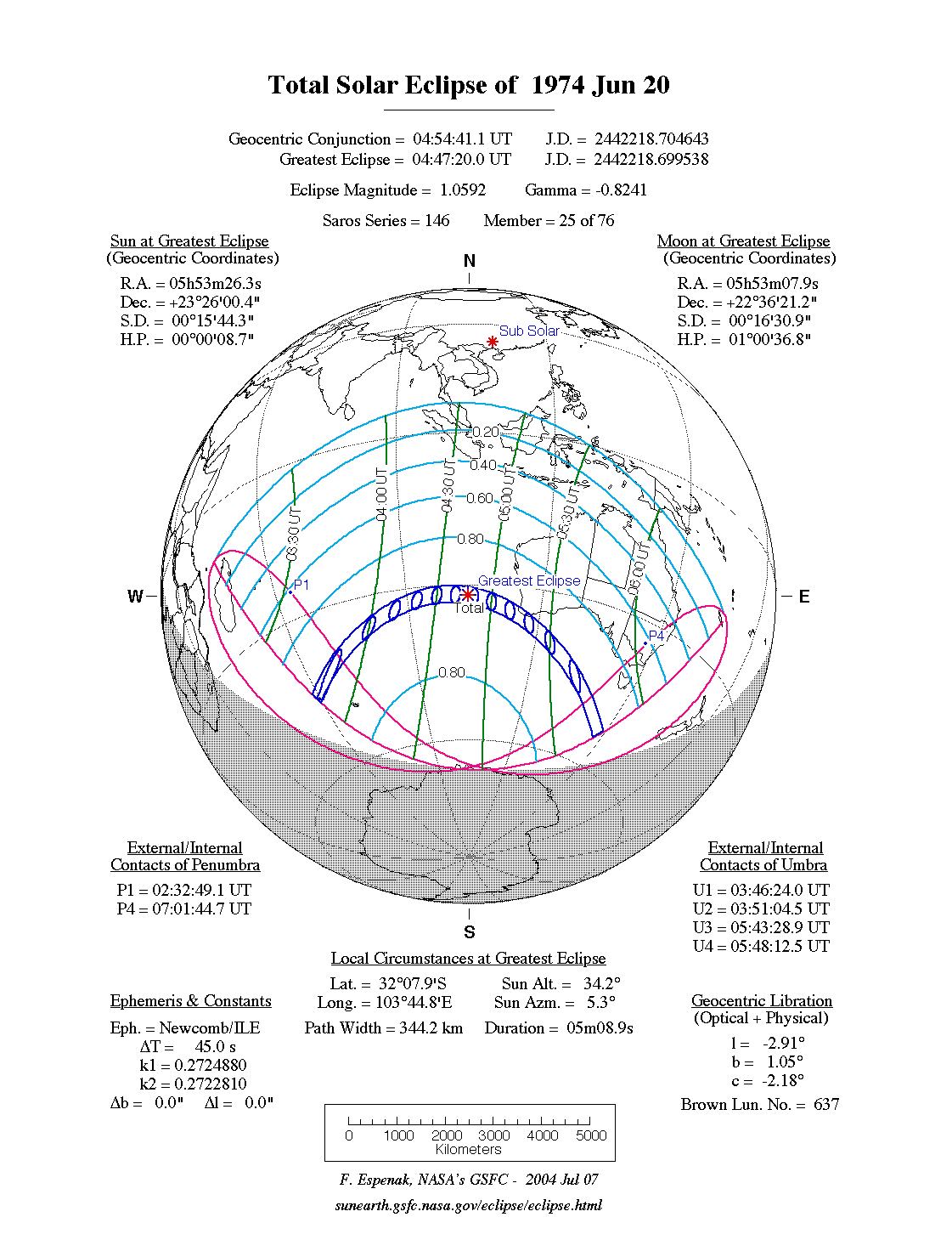 - Path Table: Total Solar Eclipse of 1974 Jun 20 - coordinates of the central line and path limits
