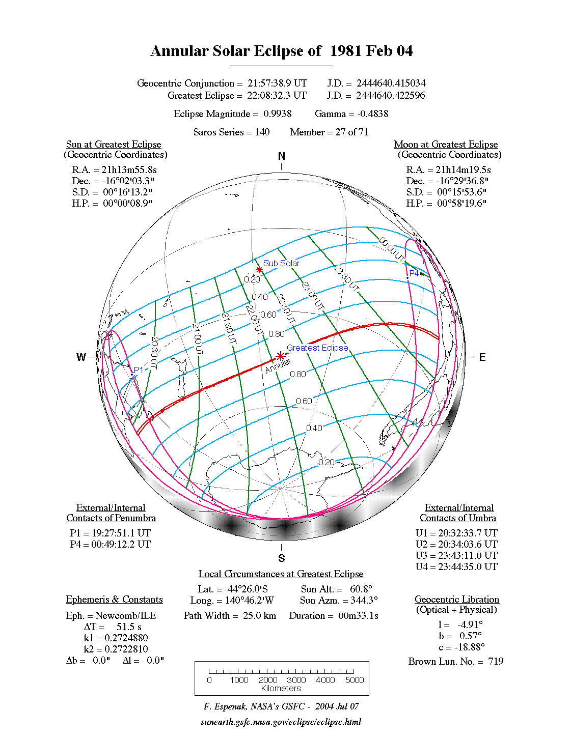 - Path Table: Annular Solar Eclipse of 1981 Feb 04 - coordinates of the central line and path limits
