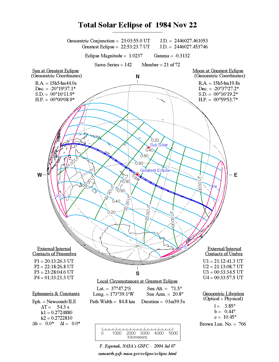 - Path Table: Total Solar Eclipse of 1984 Nov 22 - coordinates of the central line and path limits