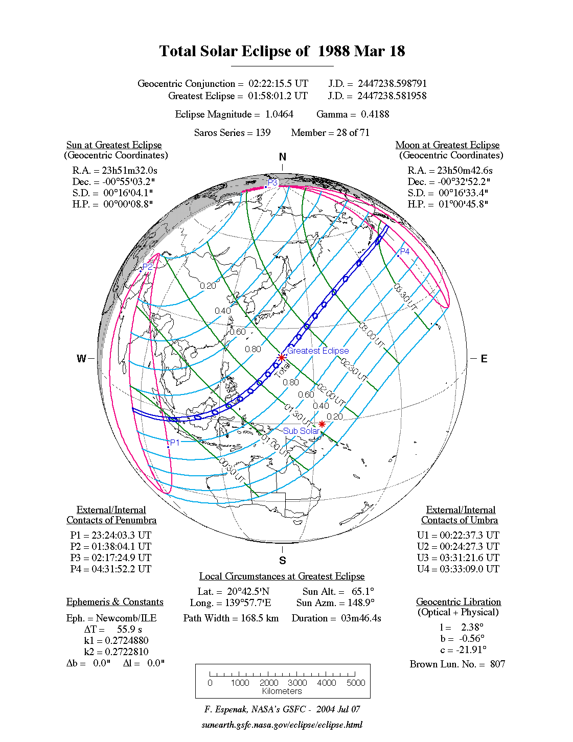 - Path Table: Total Solar Eclipse of 1988 Mar 18 - coordinates of the central line and path limits
