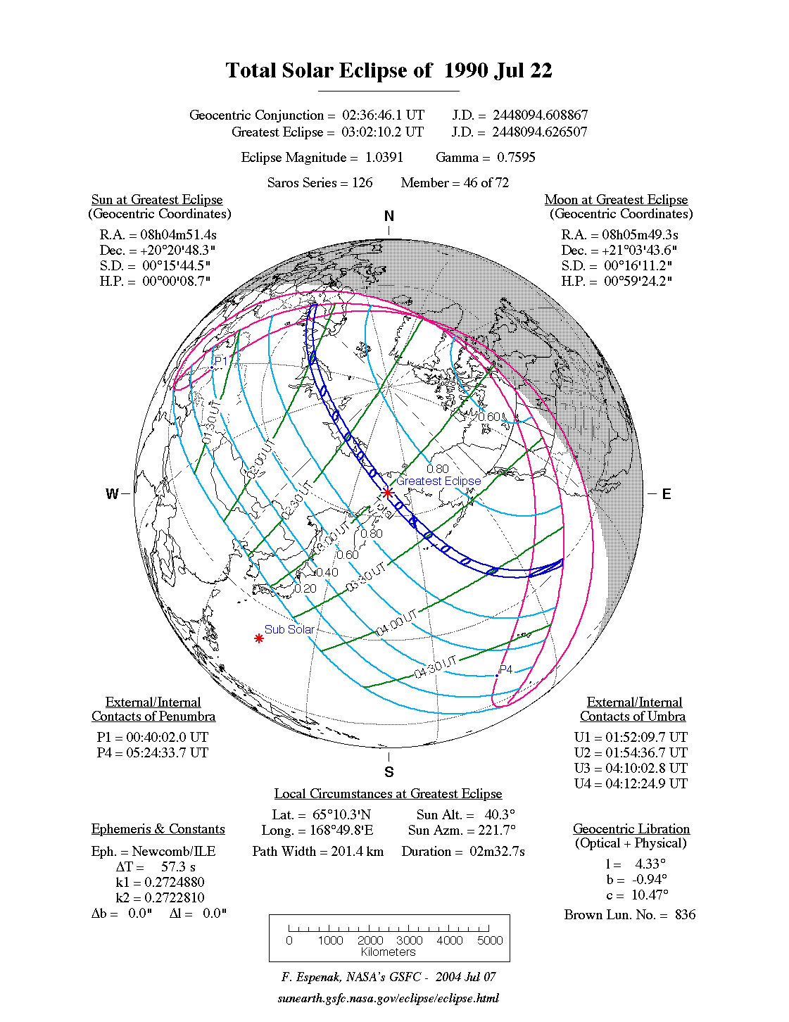- Path Table: Total Solar Eclipse of 1990 Jul 22 - coordinates of the central line and path limits