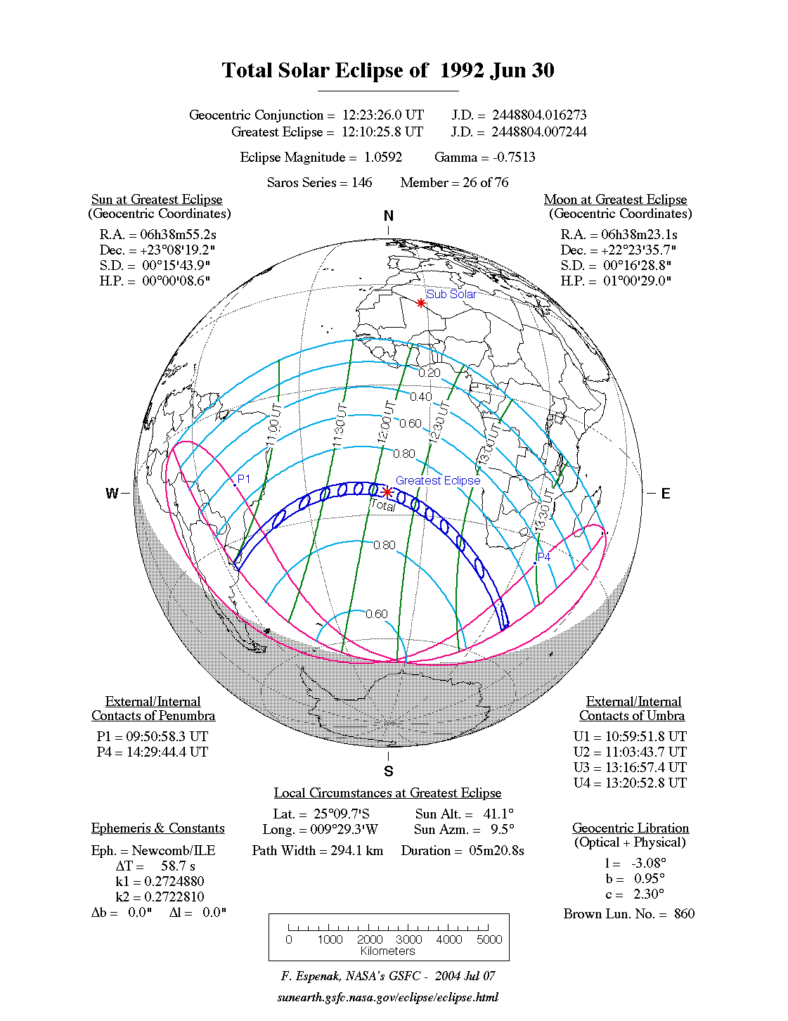 - Path Table: Total Solar Eclipse of 1992 Jun 30 - coordinates of the central line and path limits