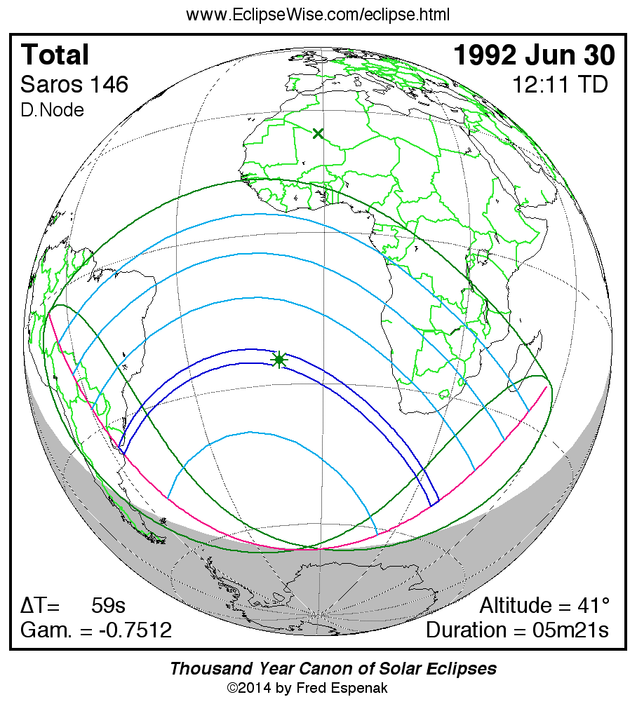 - Orthographic Map: Total Solar Eclipse of 1992 Jun 30 - detailed map of eclipse visibility