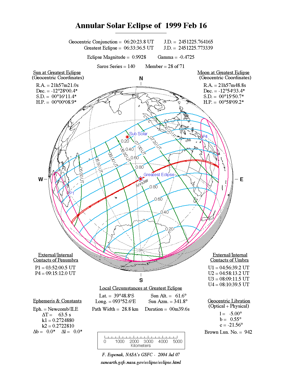 - Path Table: Annular Solar Eclipse of 1999 Feb 16 - coordinates of the central line and path limits