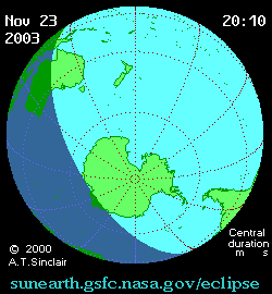 - Animated Map: Total Solar Eclipse of 2003 Nov 23 - animated map of the Moon's shadows across Earth