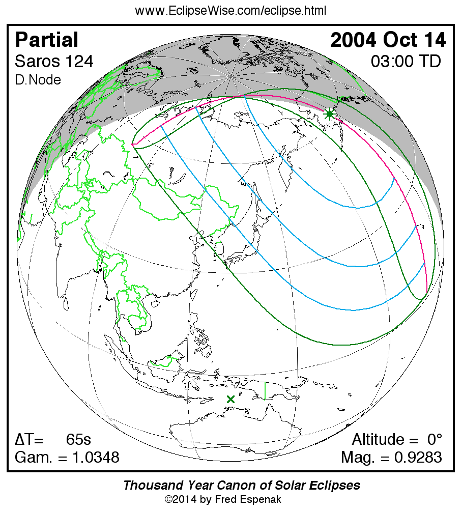 - Orthographic Map: Partial Solar Eclipse of 2004 Oct 14 - detailed map of eclipse visibility