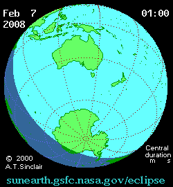 - Animated Map: Annular Solar Eclipse of 2008 Feb 07 - animated map of the Moon's shadows across Earth