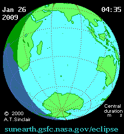 - Animated Map: Annular Solar Eclipse of 2009 Jan 26 - animated map of the Moon's shadows across Earth