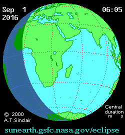 - Animated Map: Annular Solar Eclipse of 2016 Sep 01 - animated map of the Moon's shadows across Earth