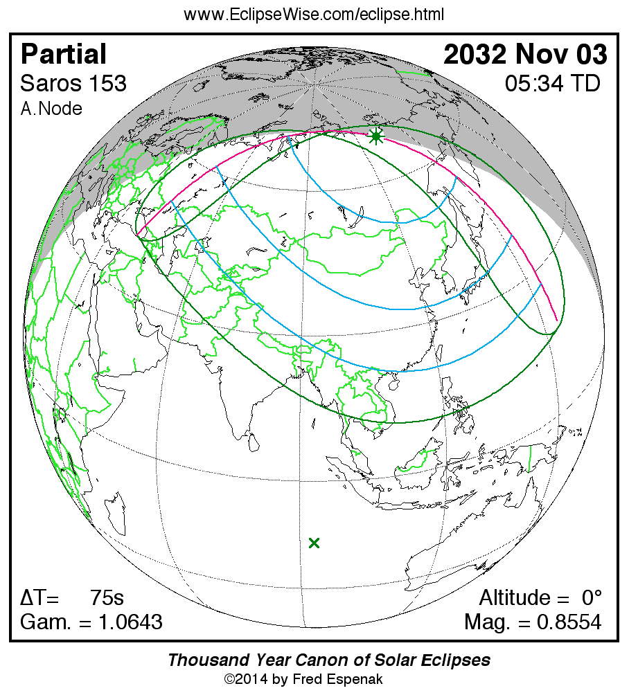 - Orthographic Map: Partial Solar Eclipse of 2032 Nov 03 - detailed map of eclipse visibility