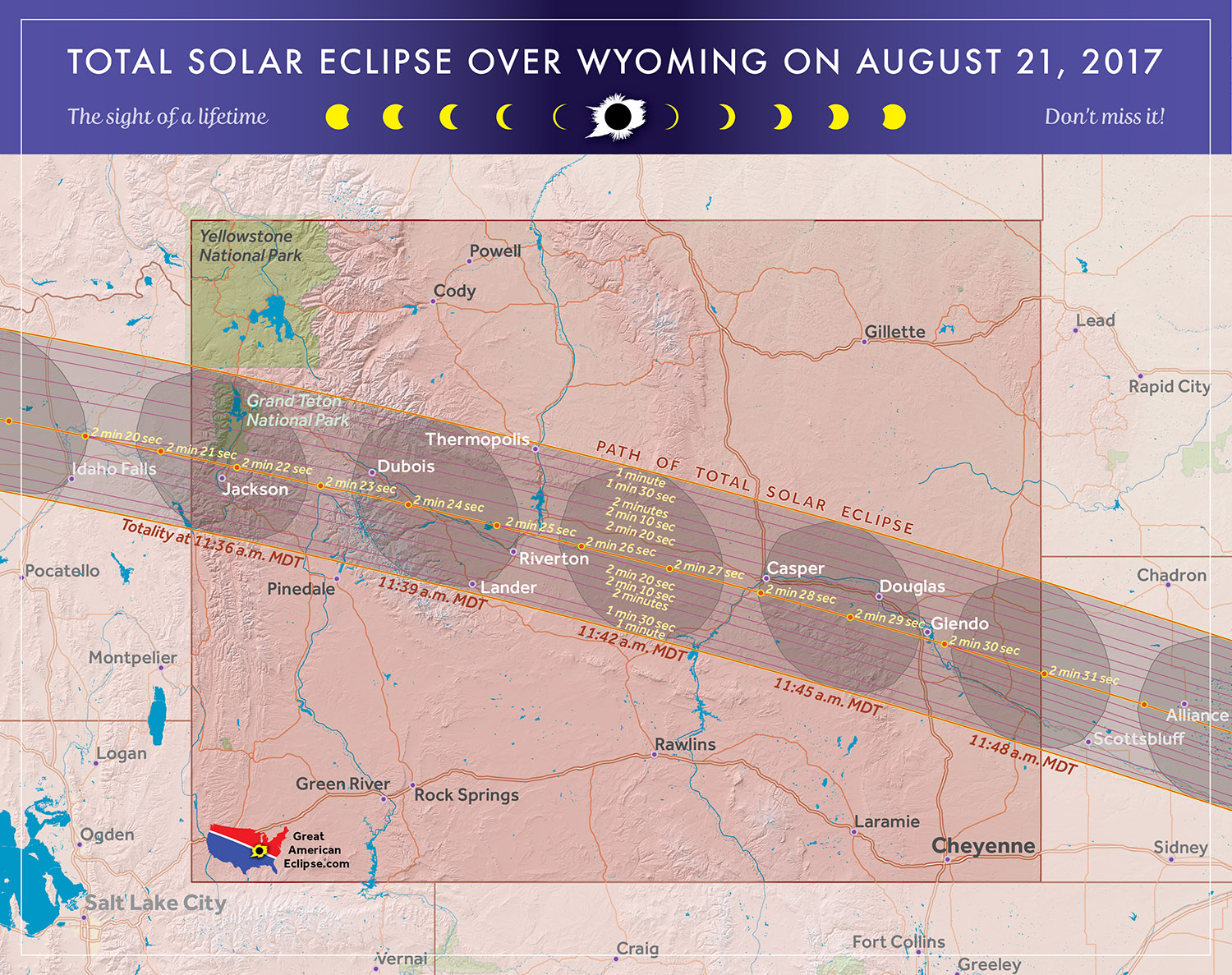 (average width is 67.1 miles) - Across Wyoming (from west to east) the central line duration of totality increases from 2 minutes 19 seconds to 2 minutes 29 seconds.