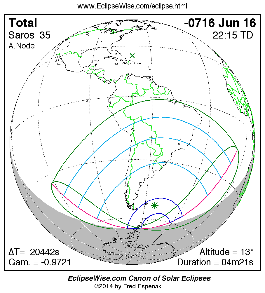 - Orthographic Map: Total Solar Eclipse of -0716 Jun 16 - global map of eclipse visibility