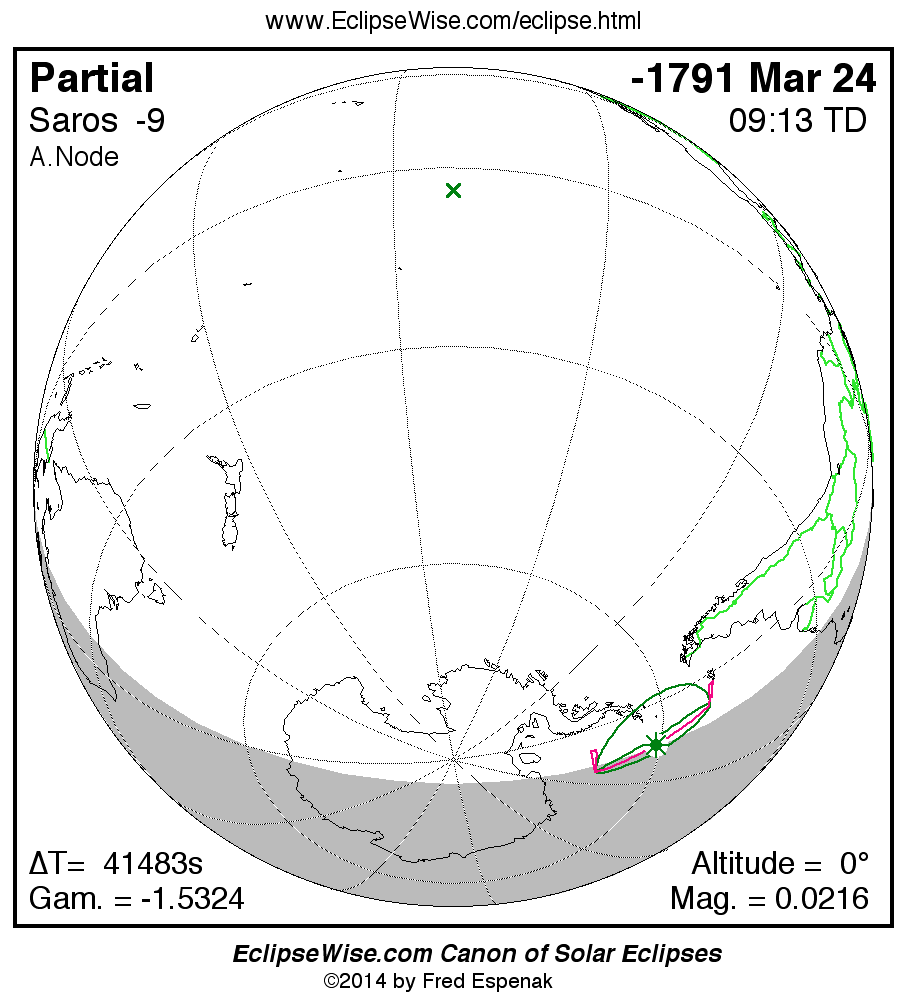 The eclipse belongs to Saros -9 and is number 75 of 75 eclipses in the series. Thus, the -1791 Mar 25 event is the last eclipse of the series . All eclipses in this series occur at the Moons ascending node. The Moon moves southward with respect to the node with each succeeding eclipse in the series and gamma decreases.