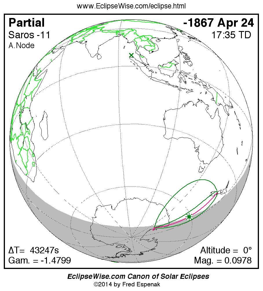 The eclipse belongs to Saros -11 and is number 72 of 72 eclipses in the series. Thus, the -1867 Apr 24 event is the last eclipse of the series . All eclipses in this series occur at the Moons ascending node. The Moon moves southward with respect to the node with each succeeding eclipse in the series and gamma decreases.
