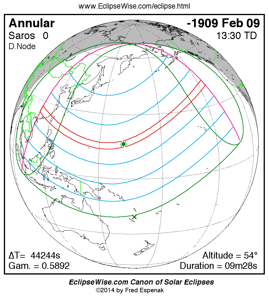 - Path Table: Annular Solar Eclipse of -1909 Feb 09 - coordinates of the central line and path limits