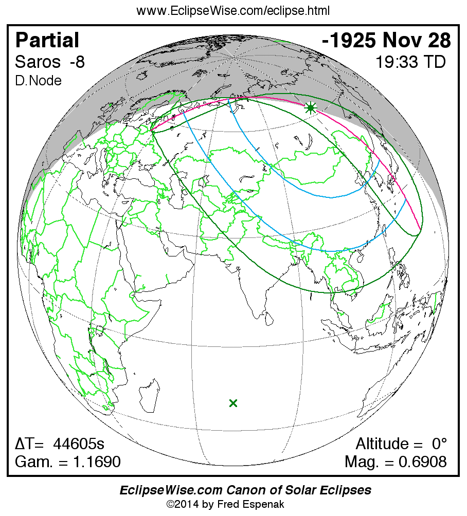 The instant of greatest eclipse takes place on -1925 Nov 28 at 19:33:14 TD (07:09:54 UT1).