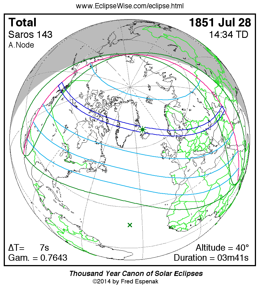 The instant of greatest eclipse takes place on 1851 Jul 28 at 14:33:42 TD (14:33:35 UT1).
