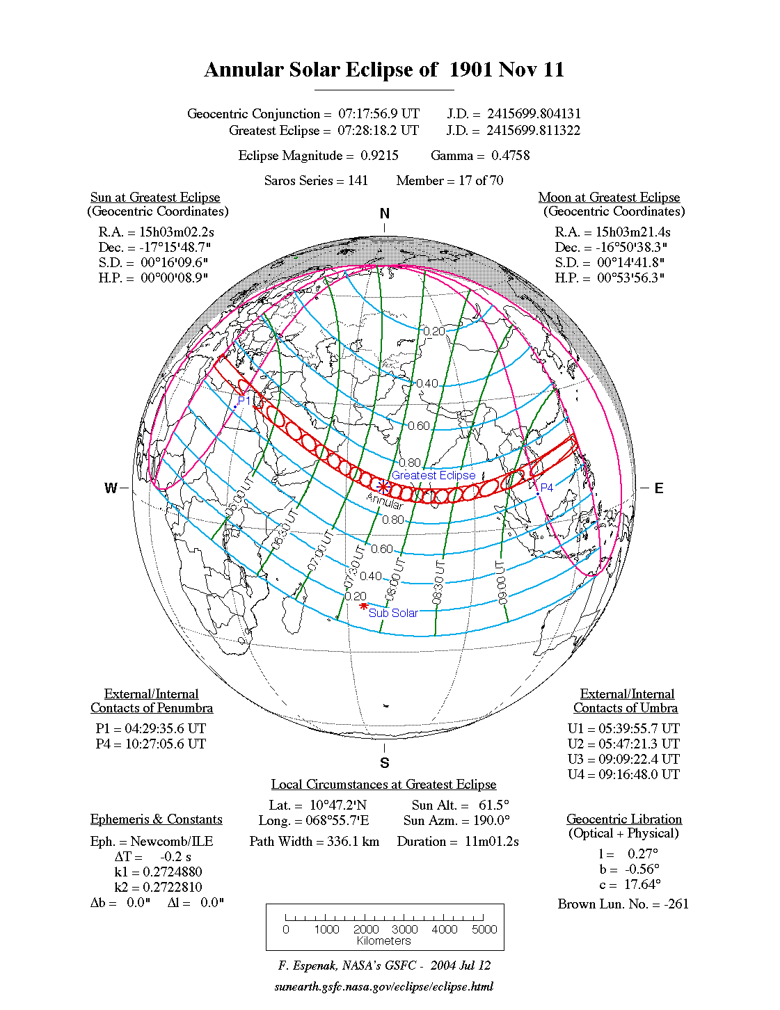 - Path Table: Annular Solar Eclipse of 1901 Nov 11 - coordinates of the central line and path limits