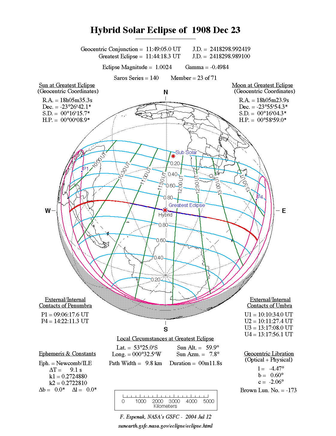 - Orthographic Map: Hybrid Solar Eclipse of 1908 Dec 23 - detailed global map of eclipse visibility (Key to Figure)