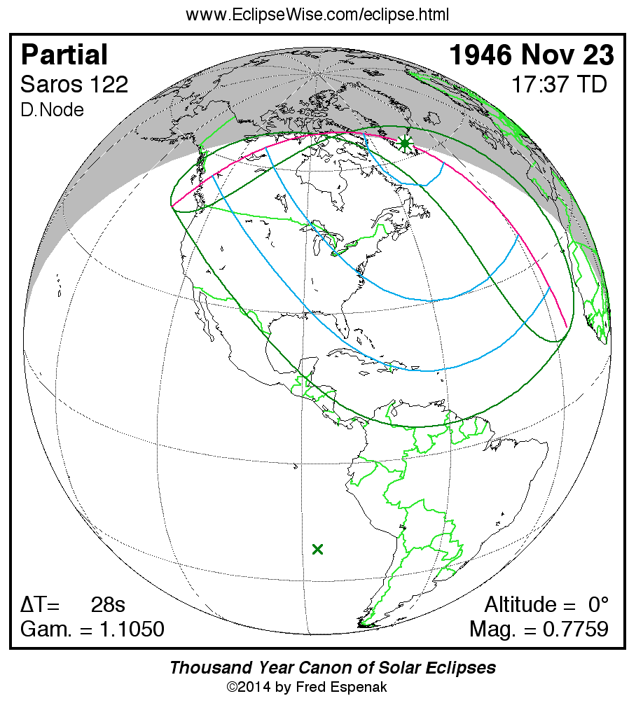 - Orthographic Map: Partial Solar Eclipse of 1946 Nov 23 - detailed global map of eclipse visibility (Key to Figure)
