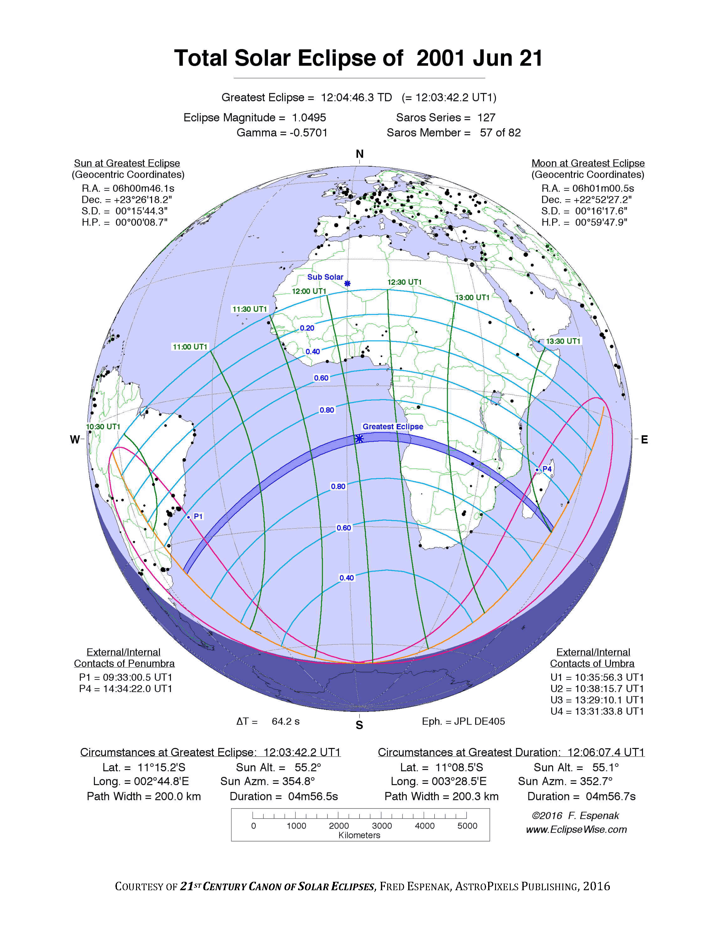 - Orthographic Map: Total Solar Eclipse of 2001 Jun 21 - detailed global map of eclipse visibility (Key to Figure)