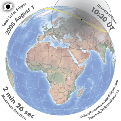 - Orthographic Map: Total Solar Eclipse of 2008 Aug 01 - detailed global map of eclipse visibility (Key to Figure)