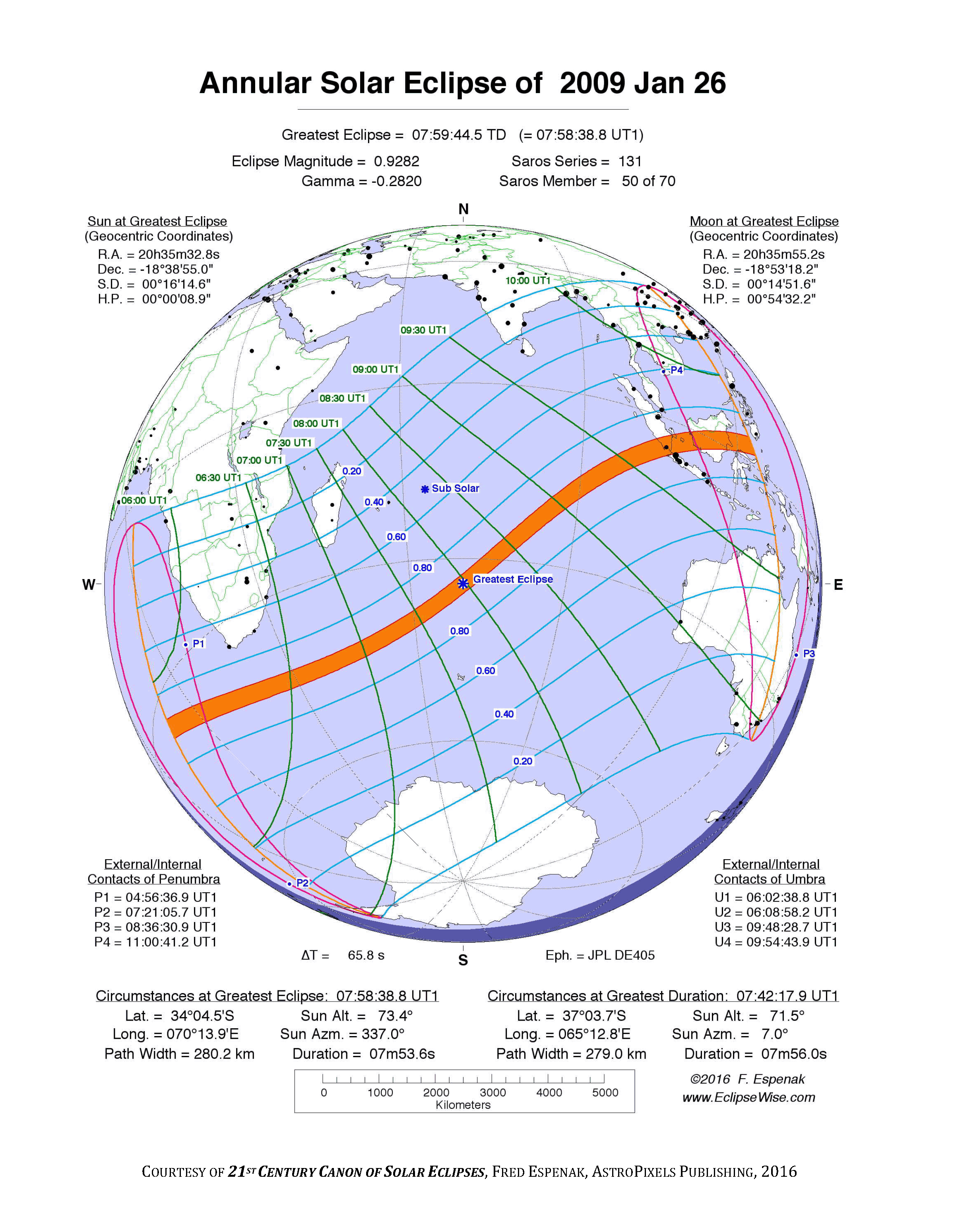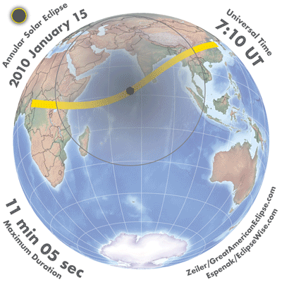 - Orthographic Map: Annular Solar Eclipse of 2010 Jan 15 - detailed global map of eclipse visibility (Key to Figure)