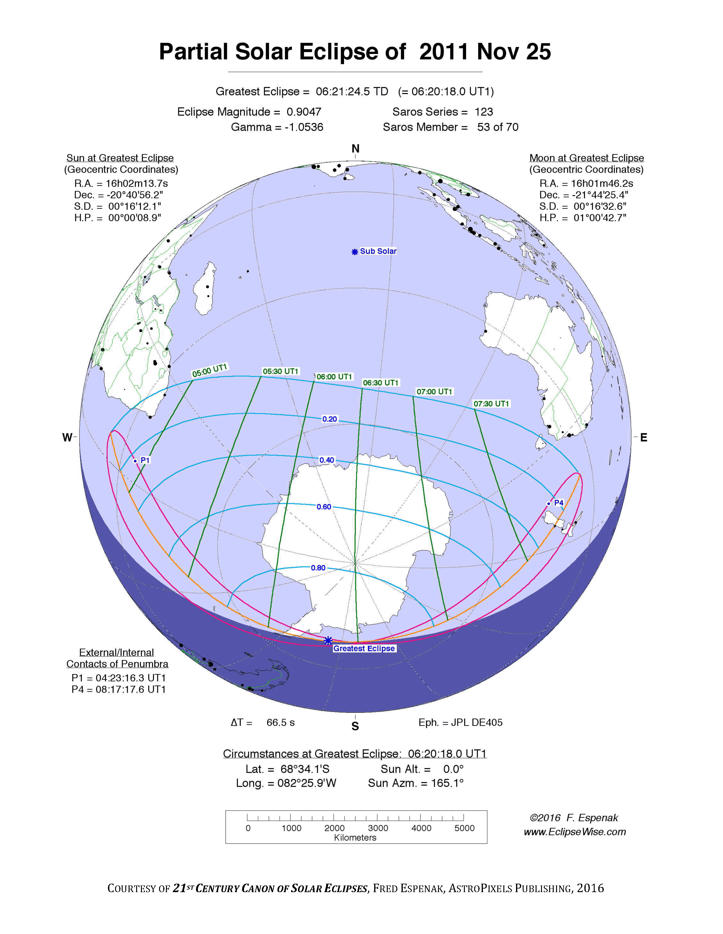 - Orthographic Map: Partial Solar Eclipse of 2011 Nov 25 - detailed global map of eclipse visibility (Key to Figure)