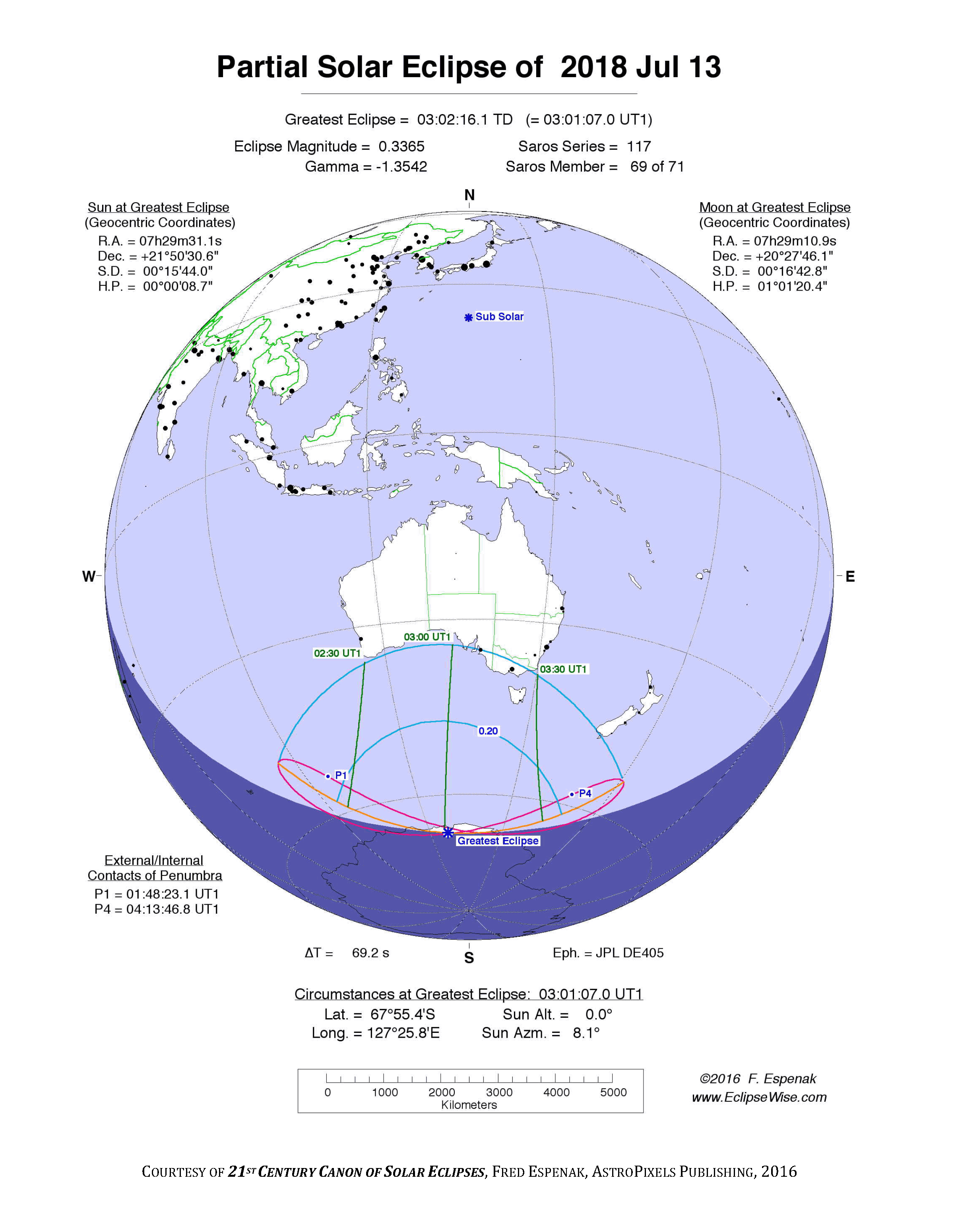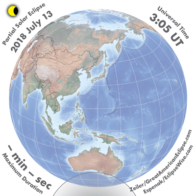 - Orthographic Map: Partial Solar Eclipse of 2018 Jul 13 - detailed global map of eclipse visibility (Key to Figure)