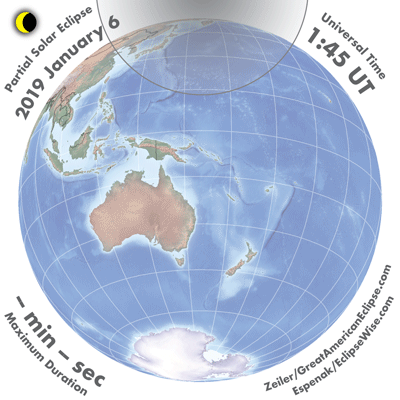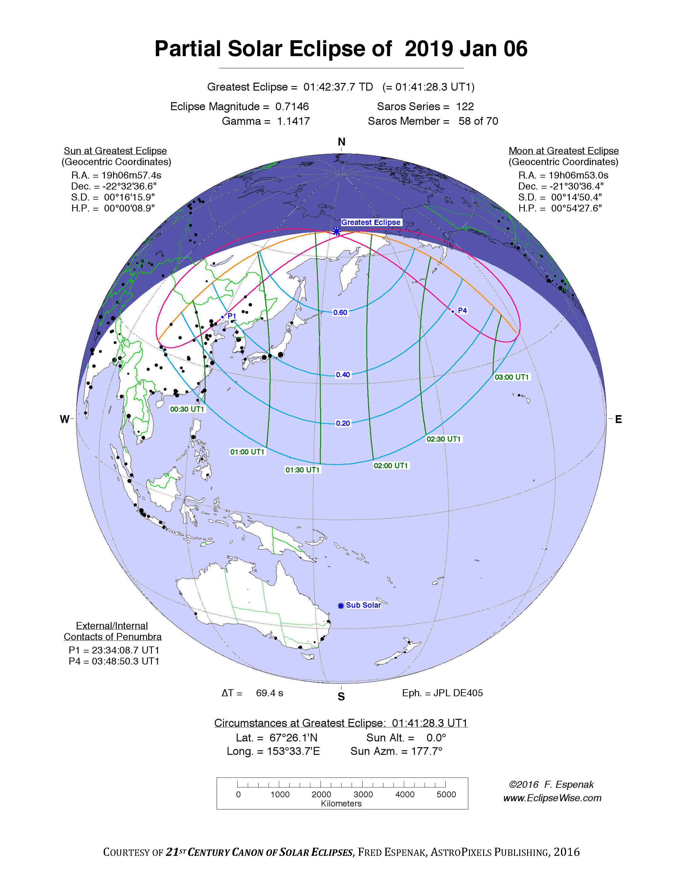 - Orthographic Map: Partial Solar Eclipse of 2019 Jan 06 - detailed global map of eclipse visibility (Key to Figure)