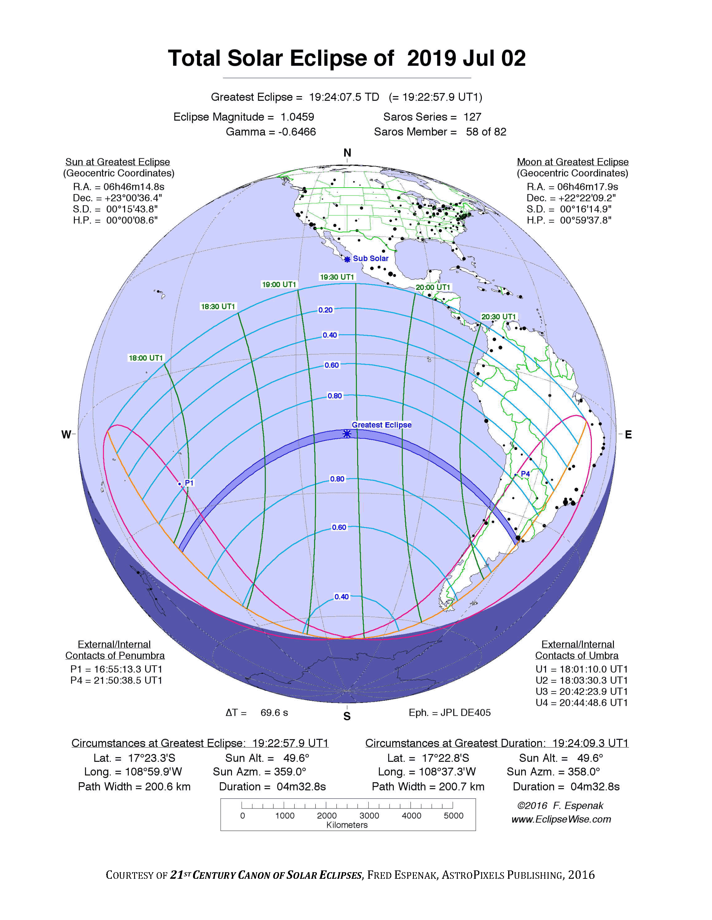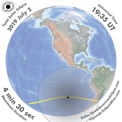 - Orthographic Map: Total Solar Eclipse of 2019 Jul 02 - detailed global map of eclipse visibility (Key to Figure)