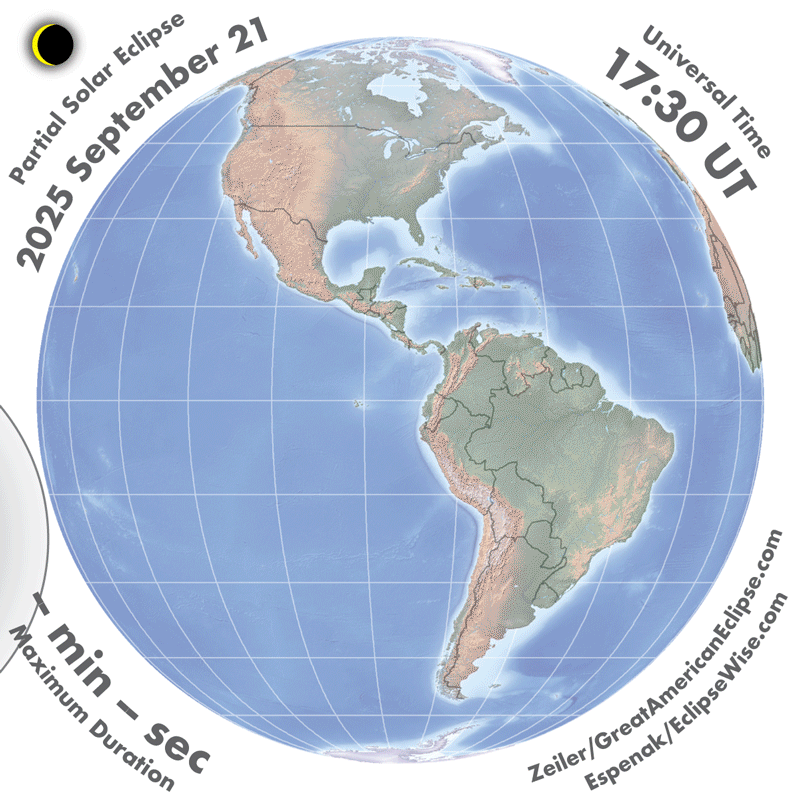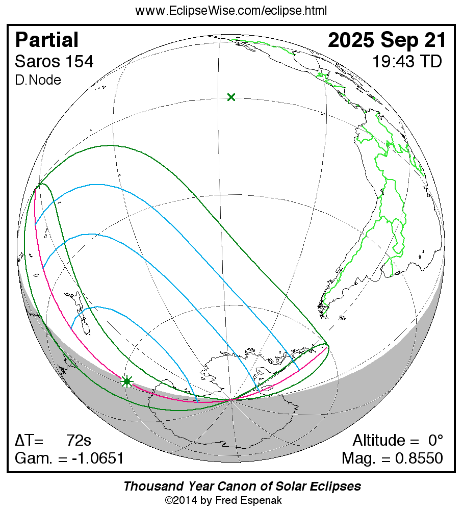 - Orthographic Map: Partial Solar Eclipse of 2025 Sep 21 - detailed global map of eclipse visibility (Key to Figure)