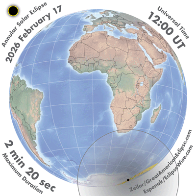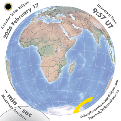 The map to the right shows a single frame from the medium size animation for the Annular Solar Eclipse of 2026 Feb 17 . In the upper left corner is the type of eclipse and the eclipse date. To the upper right is the Universal Time. The lower left corner displays the instantaneous duration of annularity. To the lower right is the credit for the animation.