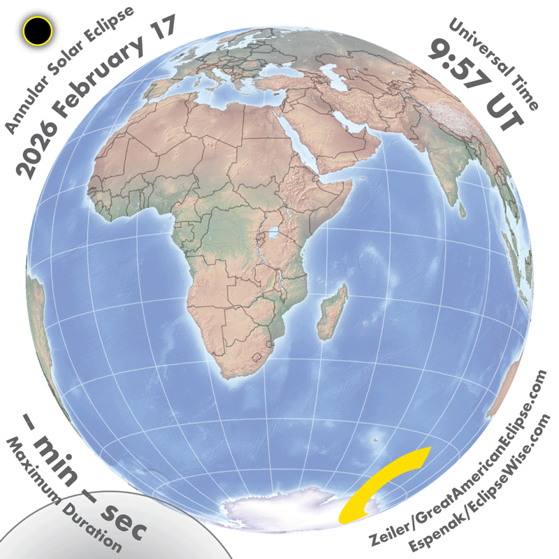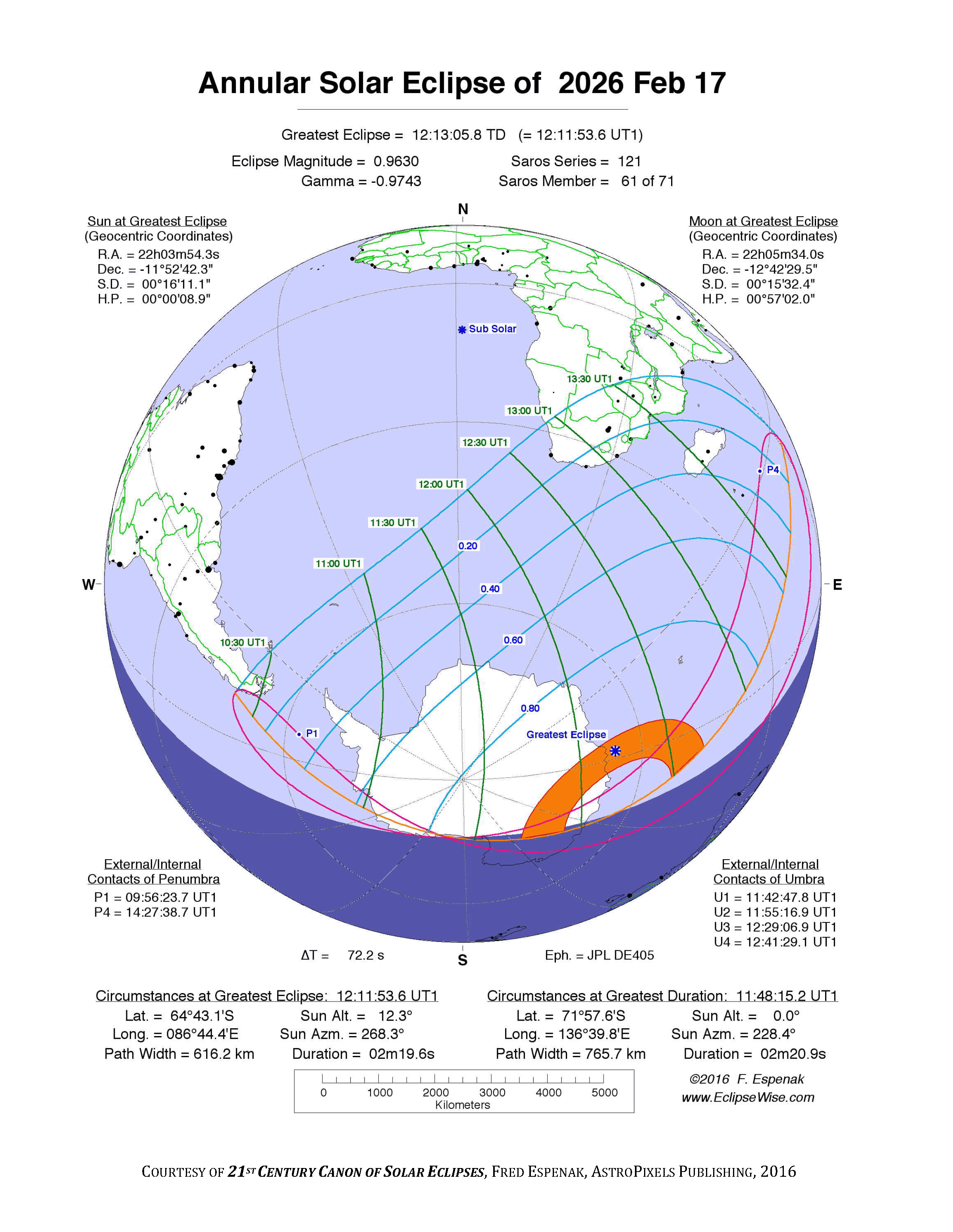 - Orthographic Map: Annular Solar Eclipse of 2026 Feb 17 - detailed global map of eclipse visibility (Key to Figure)