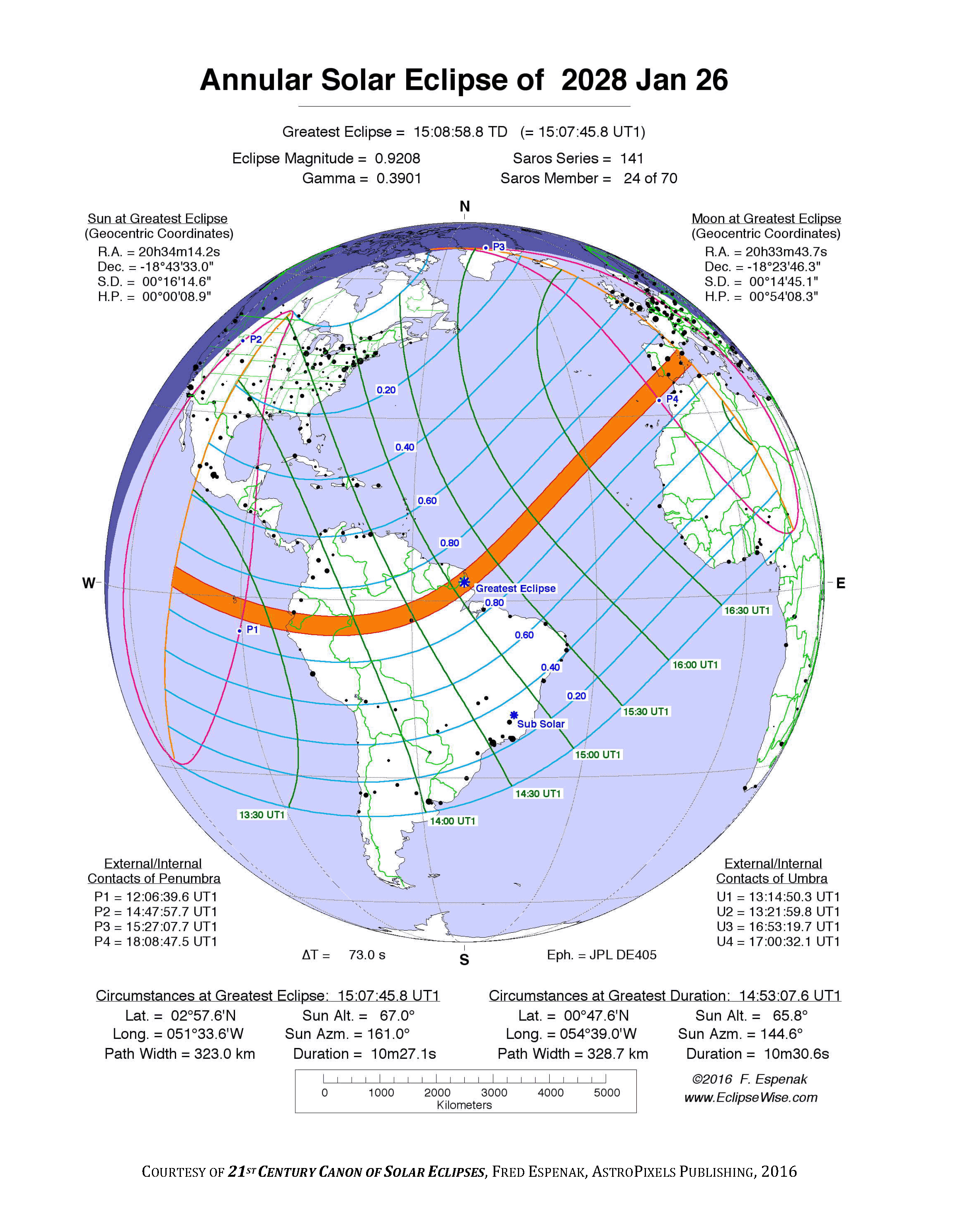 - Orthographic Map: Annular Solar Eclipse of 2028 Jan 26 - detailed global map of eclipse visibility (Key to Figure)