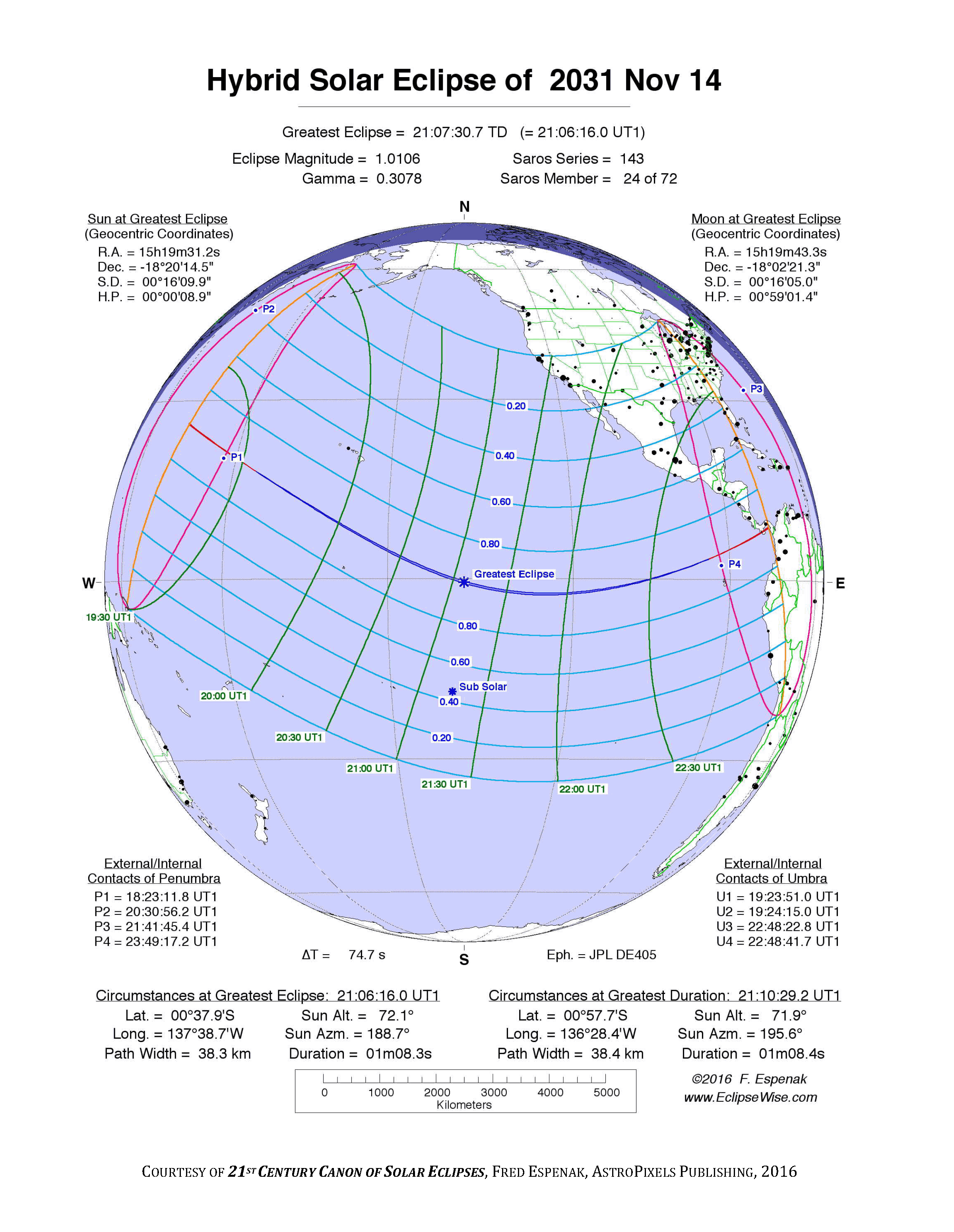 - Orthographic Map: Hybrid Solar Eclipse of 2031 Nov 14 - detailed global map of eclipse visibility (Key to Figure)