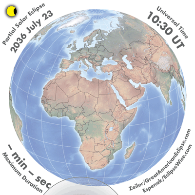 - Orthographic Map: Partial Solar Eclipse of 2036 Jul 23 - detailed global map of eclipse visibility (Key to Figure)