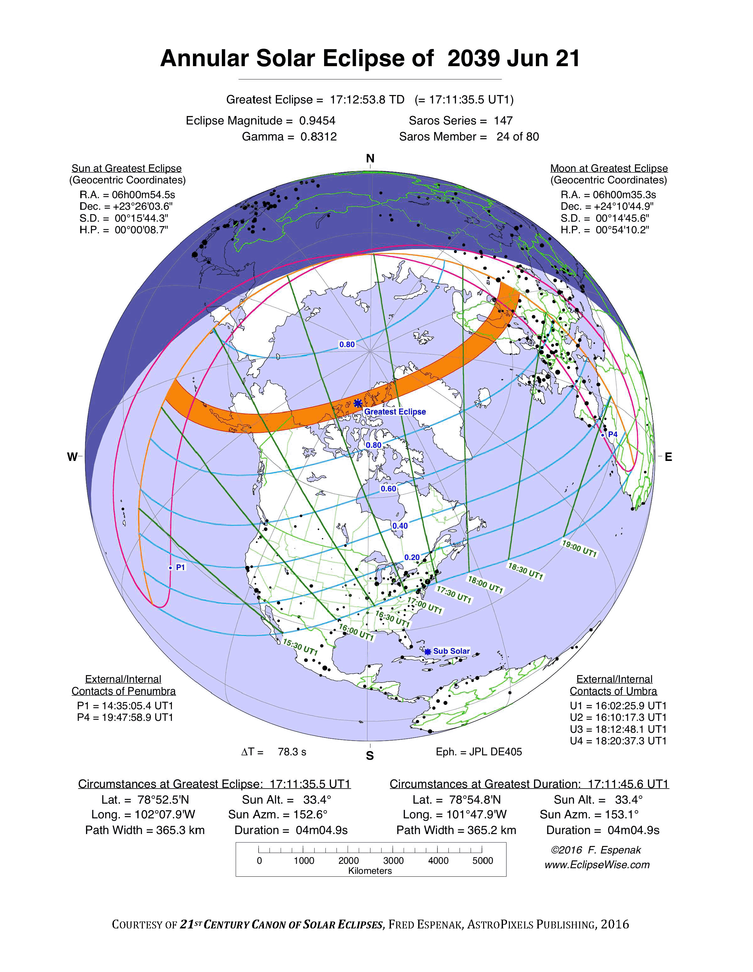 - Path Table: Annular Solar Eclipse of 2039 Jun 21 - coordinates of the central line and path limits